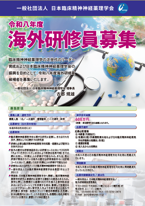 海外研修員制度は、我が国における臨床精神神経薬理学者の育成と臨床精神神経薬理学の振興を目的として発足いたしました。本年度の募集を下記の要領で行いますので、適切な方のご推薦、またはご応募をいただければ幸いに存じます。